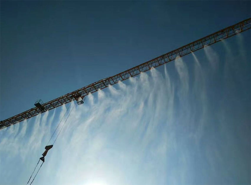 The horizontal arm of tower crane is always at the highest point of the site. The sprinkler system sprays water at all directions and zero dead angle in the rotating range of the tower crane. Water sprays water mist through the nozzle, which can effectively absorb dust particles and impurities in the air, control the dust from the construction site not to spread out, and play the role of dust reduction. At the same time, spraying water at high altitude can effectively absorb dust particles and impurities in the air. After a period of time, the ground will form a wet state, which can effectively suppress the dust to rise again.