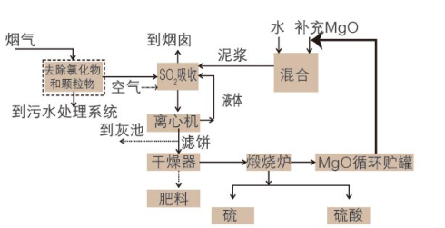 濕法氧化鎂工藝主要由煙氣系統(tǒng)、漿液制備系統(tǒng)、洗滌及吸收系統(tǒng)、脫水及干燥系統(tǒng)等組成。裝置副產(chǎn)品的亞硫酸鎂在硫酸廠焙燒后生成氧化鎂返回脫硫裝置。