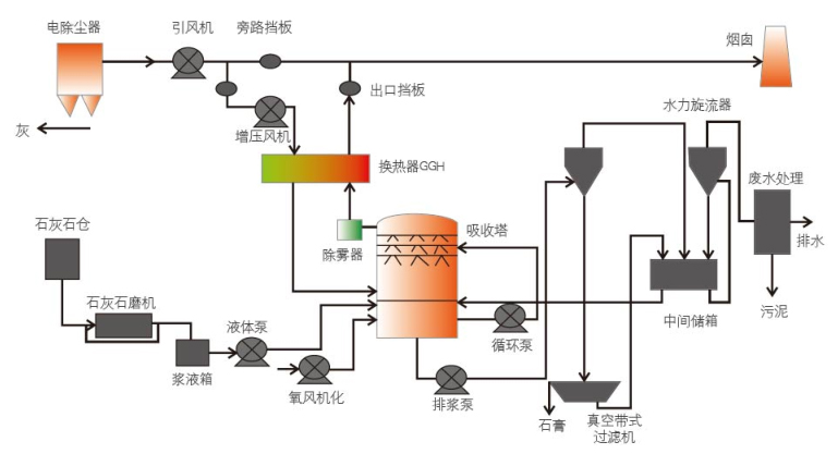 鍋爐引風(fēng)機(jī)出來的煙氣進(jìn)行換熱降溫,降溫后的煙氣進(jìn)入吸收塔下部。吸收塔中的吸收劑石灰石漿液由塔的上部向下噴淋與向上流動(dòng)的煙氣逆流混合,煙氣中的二氧化硫(SO2)與吸收漿液反應(yīng)生成亞硫酸鈣同時(shí)進(jìn)一步被鼓入的空氣中的氧氣(O2)氧化成硫酸鈣( CaSO4·2H2O)即石膏;脫硫后的潔凈飽和煙氣依次經(jīng)過除霧器除去霧滴,由脫硫風(fēng)機(jī)經(jīng)煙窗排入大氣。